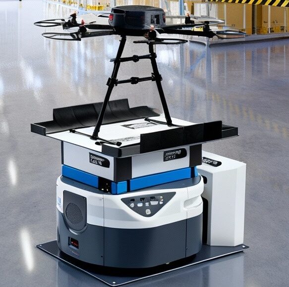 - Highest Safety Standard in the market: Safe design with tethered drone. Blue LED light on the ground robot to inform warehouse staff of automated drone operations in vicinity (to be compliant with OSH Act, 29 U.S.C. § 654 (a)(1))